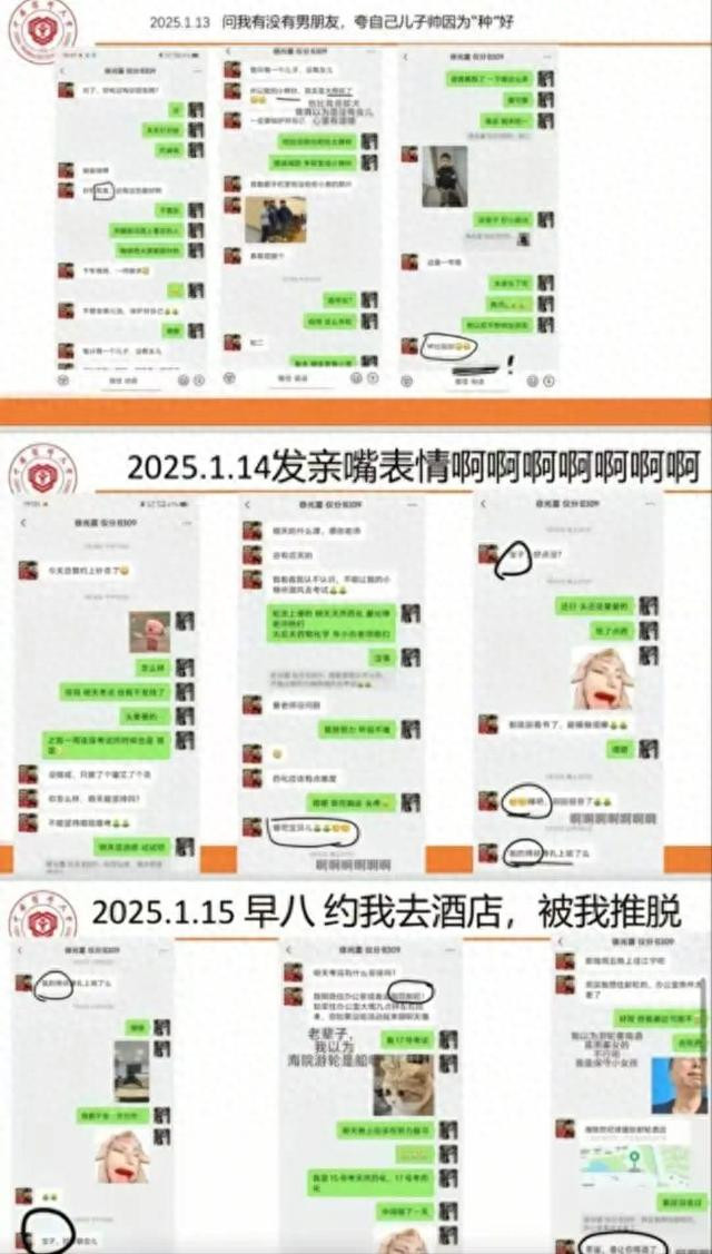 从2025年1月起,聊天内容愈发不堪入目。徐某某多次向女学生发送“亲嘴”表情,还亲昵地称呼女学生为“宝贝儿”“我的棉袄”。1月15日早上,徐某某更是直接邀请女学生去酒店,说道:“我明晚住办公室或者海院游轮,如果住办公室大概九点钟左右回来,你如果没啥活动就来聊聊天哦。”女生当即表示自己17号要考试,明天晚上得努力复习。但徐某某并未就此罢休,紧接着发送了酒店地址,女生无奈回应:“我最近可能不能喝酒,在吃药。”徐某某竟回复:“笨蛋,谁让你喝酒了,我怎么舍得让你受累。”女生只能含糊表示:“我不打包票啊。”此后,在1月16号、17号、19号,徐某某依旧不依不饶,多次发出邀请,诸如“明儿考完来我这儿拿点泸溪河”“中午带你去邮轮给你开个房间睡个够”……而从1月17号之后,直至1月20号,女生不堪其扰,选择不再回复信息。